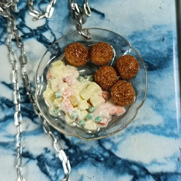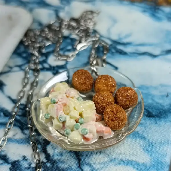 Collar con dije de plato con albóndigas y ensalada rusa modelada a mano con arcilla polimerica ,y cadena de acero quirúrgico.