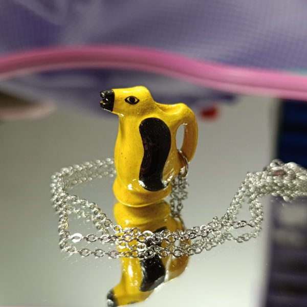 El dije, una jarra pingüino miniatura color amarillo, está elaborado a mano en cerámica esmaltada.