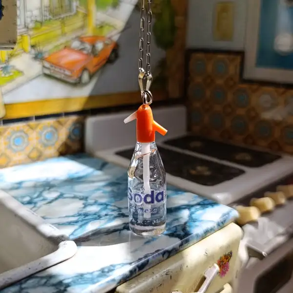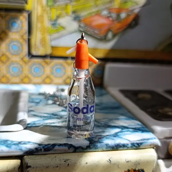 Este collar con dije de sifón de soda miniatura está inspirado en los icónicos sifones de los años 70, con pico de color y su etiqueta que simula la serigrafía original, realizado en resina que incluso parece tener soda adentro.