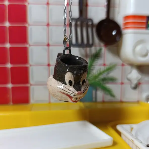 El dije, una taza miniatura retro con diseño de conejo Bugs Bunny está elaborado a mano en cerámica esmaltada.
