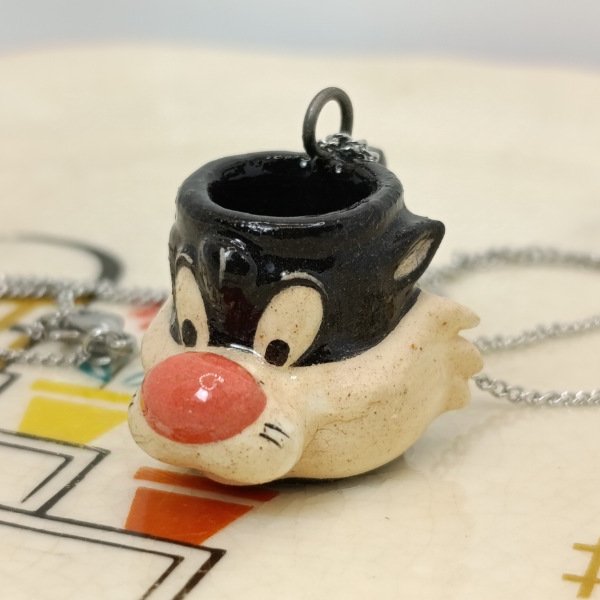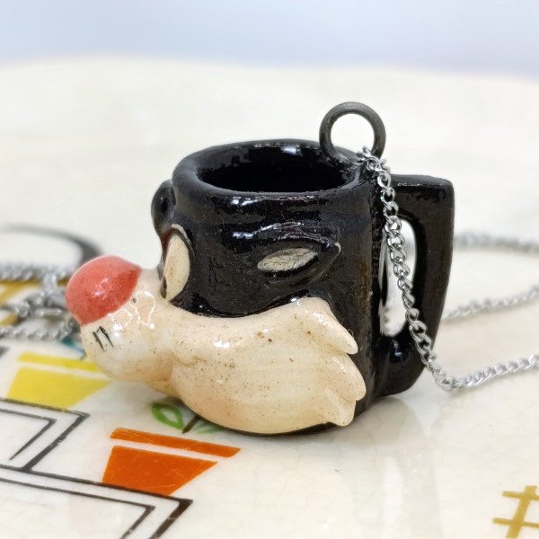 El dije, una taza miniatura retro con diseño de Gato Silvestre está elaborado a mano en cerámica esmaltada.