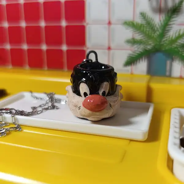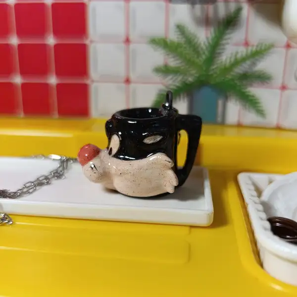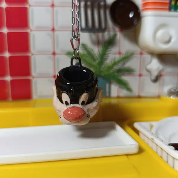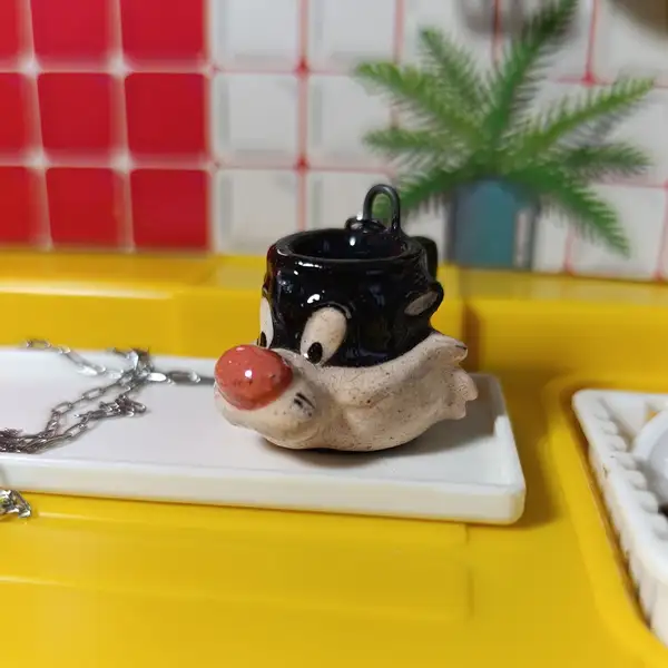 El dije, una taza miniatura retro con diseño de Gato Silvestre está elaborado a mano en cerámica esmaltada.